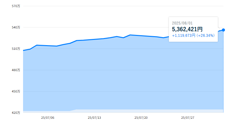 先月の5,092,806円、利益872,141円(20.64%)と比べると、約24万6千円の増加で、利回りは20.64%から26.34%へと順調に伸びている。数字が目に見えて動くと、やはり続けてきた手応えを感じる。