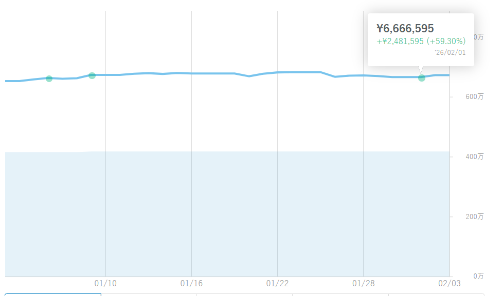 2026年の年初を迎え、評価額や利益率は一つの区切りとして確認するものの、特別な行動を取る予定はない。これまでと同様、短期の数字に一喜一憂せず、自動運用に任せながら時間をかけて積み上がっていく過程を見ていく61か月目の月初を迎え、評価益は+2,481,595円(+59.30%)まで伸び、いよいよ60%という数字が現実的な水準として視界に入ってきた。先月からは+15万円の増加となり、大きく跳ねたわけではないものの、着実に積み上がっている印象が強い。短期間での急伸というよりも、これまでの運用期間そのものが利益を押し上げている感覚に近い。