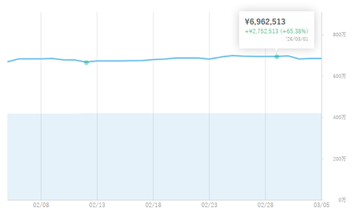 62か月目の月初で、利益は+2,752,513円(+65.38%)へ増加。65%台となり、先月と比較して+27万円となった。
